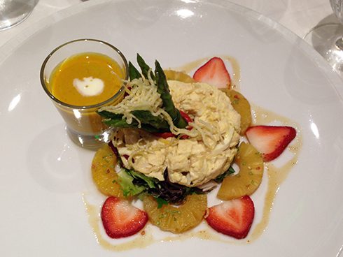 The menu included whole-wheat muffins (our table asked for seconds), curried pumpkin soup (a Nicklaus Thanksgiving staple, said Nan), chicken salad with bean sprouts and asparagus bundle marinated with sweet and sour dressing (pictured, Lynn Kalber) and a glorified brownie sundae with Jack Nicklaus homemade vanilla ice cream for dessert. The wine served was Jack Nicklaus house red (cabernet sauvignon) and house white (chardonnay). Both were nice wines, and the chardonnay went beautifully with the chicken salad.