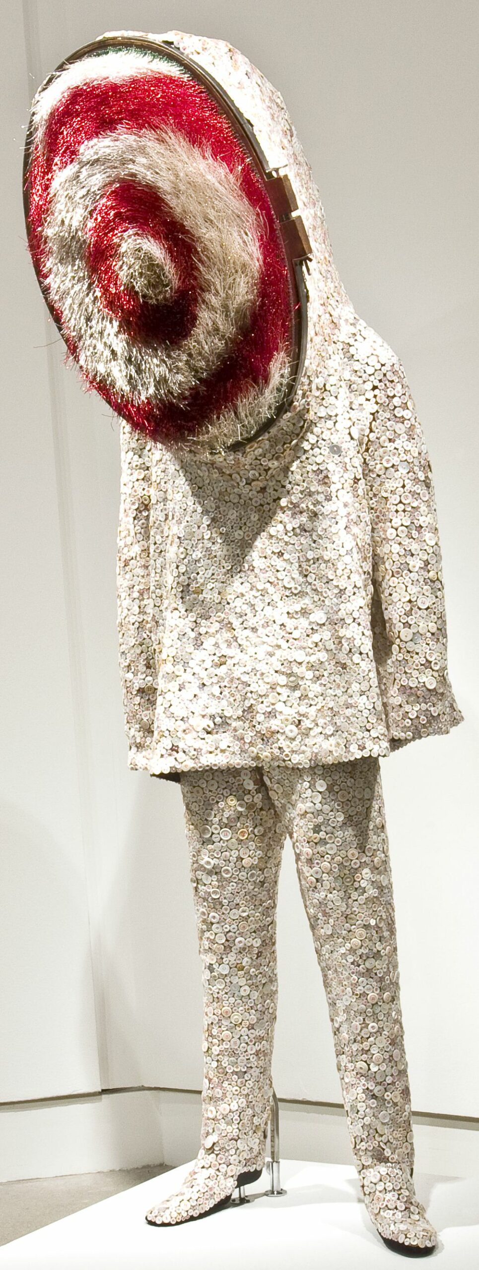 Furthermore, Nick Cave’s “Soundsuit” (above), a mannequin studded from neck to toe with buttons and with the head replaced by a swirling vortex of red-and-white metal fibers, is both an aesthetically inventive costume and a commentary on the erasure of personal identity, which Cave has experienced as a double minority – as a gay man and a black man. The three street photographs by the legendary Gordon Parks are both poetically beautiful and strikingly social-realistic, revealing life even while they artistically enhance it.