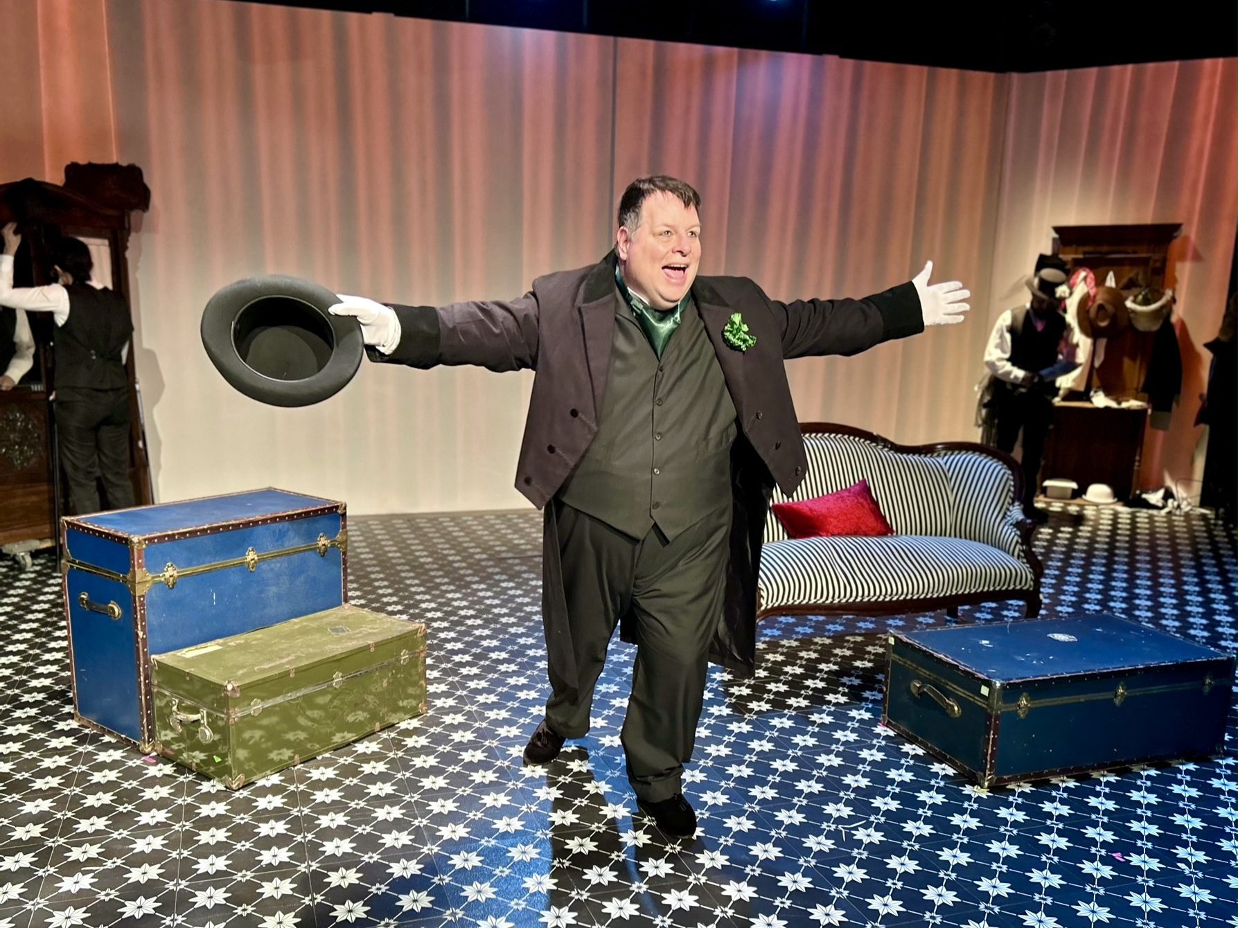 Stodard’s costume design is its customary cornucopia of delights, from the black top hats and elegant suits and furs of aristocratic fin de siècle Europe to the wittily chosen attire for the plays-within-the-play. Larsen sports a towering white wig and blue cape, to great comic effect, as Lady Bracknell in “The Importance of Being Ernest;” Obst dons a spattered apron and a bedazzled beret as the painter of Dorian Gray. In a decision as expedient for the storytelling as it is transparent for the audience, all costume changes are completed onstage, as supplied in corner bureaus or trunks, but with Matt Griffin’s lighting design deftly directing us away from these actions, we hardly notice the swift transformations.