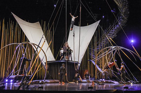 Among the encountered are an amphibian-esque female and a clan of whimsical critters who bend and intertwine their bodies like river reeds. A baton twirler, a swarm of bouncing gymnasts and a collection of fearless stuntmen catapulting from self-propelled swings leave no stone unturned.