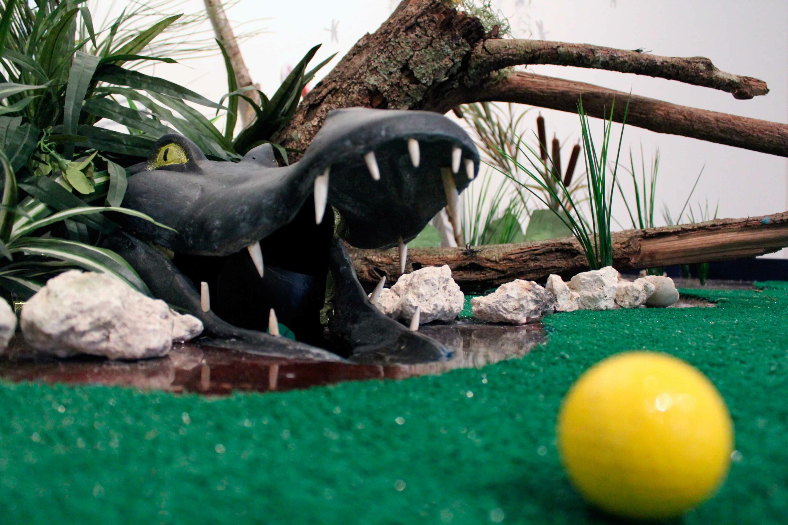 Yesterday morning, the Boca Raton Museum of Art did not resemble a storied hall of culture so much as a daycare center. Clusters of frolicking tykes and their harried chaperones picked up putters, golf balls and score sheets to play through the museum’s new exhibition, “Big Art:Miniature Golf,” an 11-hole indoor golf course designed by 11 different artists selected from the across the country. In the process, if the kids were old enough to read, they could have pondered some of the artists’ descriptions of their puttable installations, from an sociopolitical inquiry into the sexually and culturally loaded word “swallow,” to a meditation on the endless expanse of infinity, to a treatise on globalization and a commentary on the United States’ suspension of its space program. If you happen to be an adult who wants to absorb the hefty inspirations behind the designs, that’s great – but you may have to dodge a wayward golf ball or two, while taking into account that parts of the installations have been toppled by heedless children.