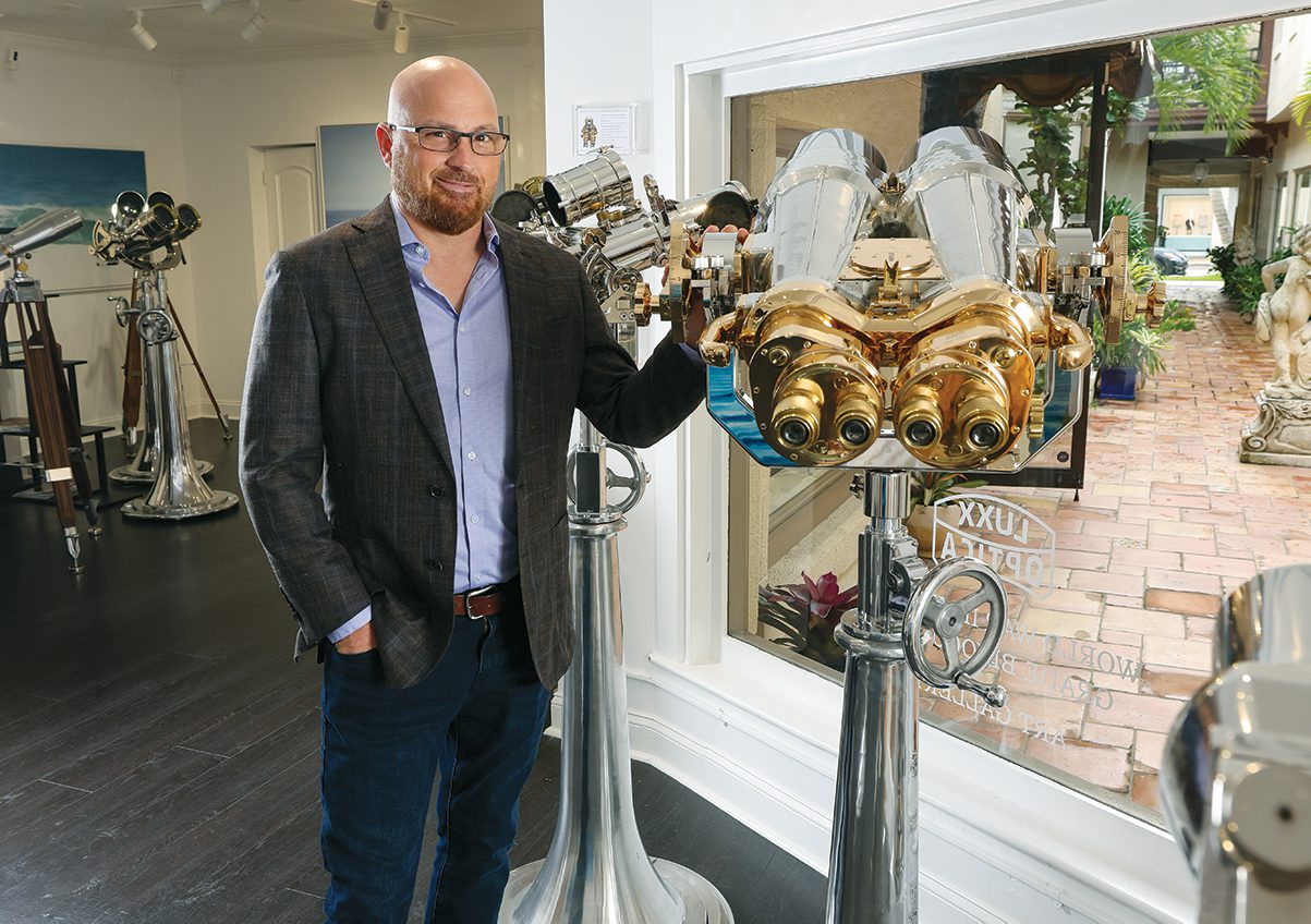 Each set of antique “big eye” binoculars in Luxxoptica’s showroom off Worth Avenue has its…