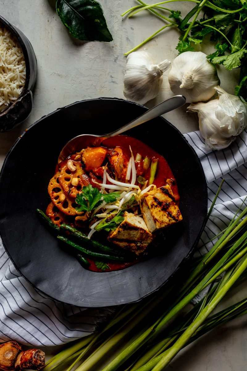 The curry shown ($19) is Thai based, with grilled tofu, coconut milk-based sauce with lotus root, green beans, eggplant, scallions, calabaza and cashews over basmati rice.