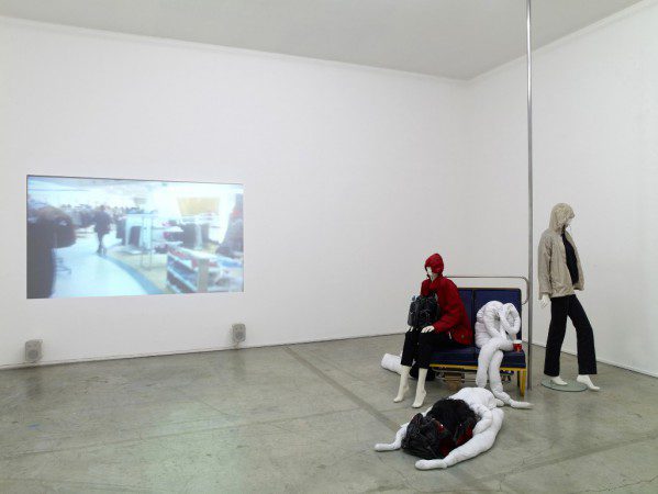 In Morag Keil’s installation “Moarg Keil,” a small group of mannequins are slouched on or near a subway bench, carrying duffels and draped in jackets. It’s a benign enough moment, a bit of commonplace Americana not far removed from George Segal’s bronze sculptures of drifters lingering around streetlamps. The more you look at “Moarg Keil,” though, the more it unsettles. A few of the mannequins are made of cloth; one is headless, its arms a pretzel, while a fully formed mannequin tries to grasp it as it seems to melt away. The whole time, a “kinetic sculpture” plugged into the ground, creates an unceasing, grating noise, like a skipping record – technology stuck in limbo. Completing the eerie installation is a video of customers blithely shopping in a clothing store, oblivious to the metronomic dreariness outside.