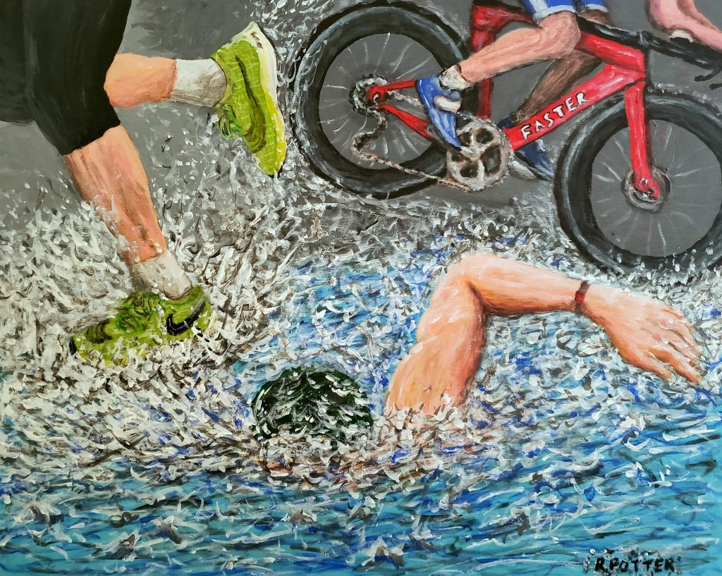 Other highlights include Robbie Potter’s painting (shown above) of triathletes in competition; a splashy painting of Lionel Messi from renowned West Palm Beach artist Kyle Lucks; and equestrian action photography by Bruce Bain. As the exhibit’s name suggests, many of its pieces showcase sports as an exemplar of movement and emotion.