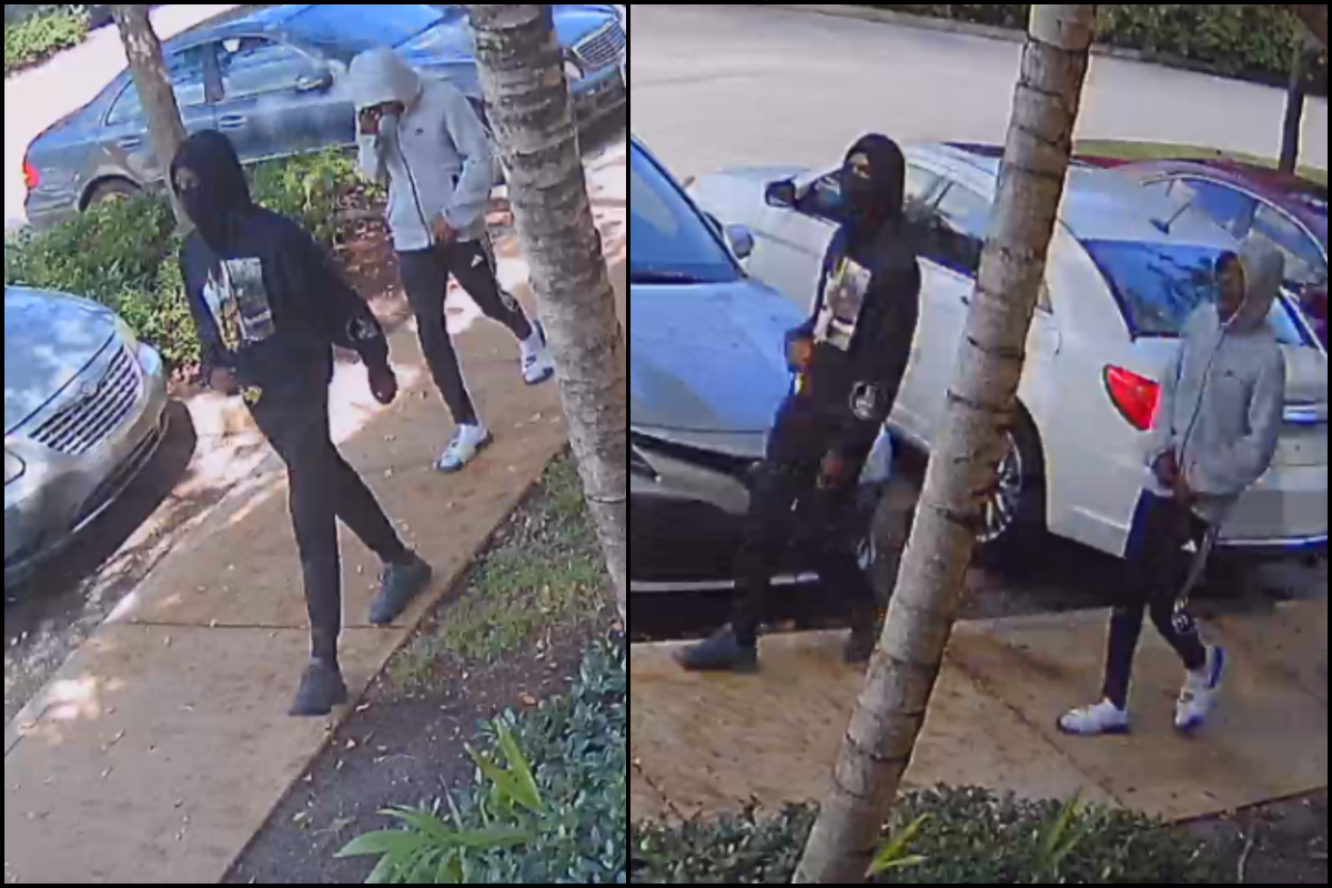 The men’s faces are covered; one is wearing a black hoodie with a design on the front, black pants, black sneakers, and a black mask covering his face below his eyes. The second suspect is wearing a zip-up gray hoodie, black track pants, and white sneakers. Both appear to be Black males.