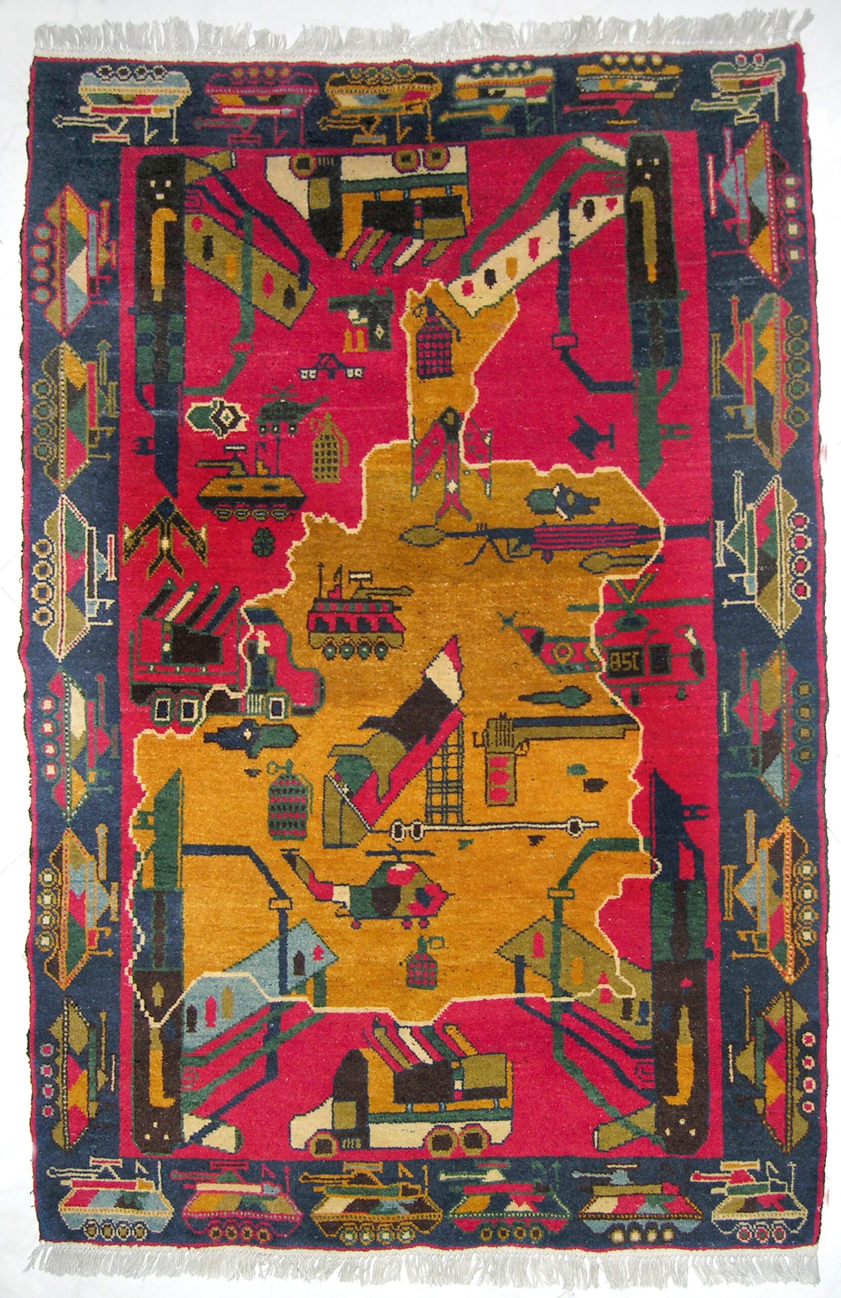 The largest and most prominent of the two, “Afghan Rugs: The Contemporary Art of Central Asia,” is something of a disappointment. Important as the subject may be—more than 40 wool rugs, woven largely by Afghani women, which serve as a therapeutic outlet for documenting the violence, topography and foreign influence around them—the exhibition is crippled by an unavoidable sameness, both in the works themselves and the regimented way in which they are displayed. We can only see so many renderings of Middle Eastern maps, guns, tanks, warplanes and military men before we yearn for a bit more variety, which finally arrives at the tail end of the exhibition.