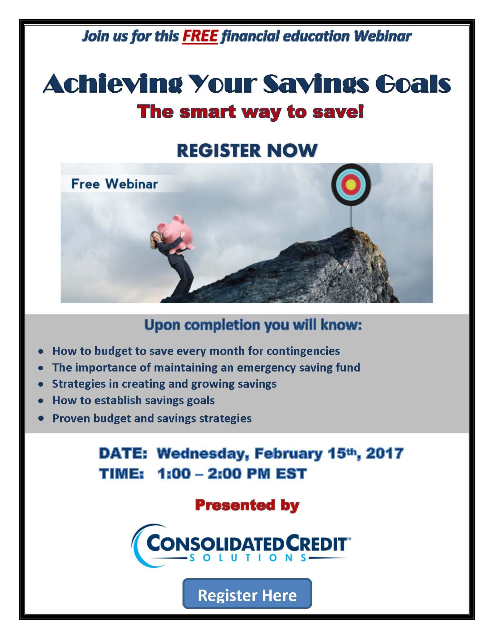 Save your spot. Register today: http://www.consolidatedcredit.org/webinars-and-seminars/achieve-savings-goals-2017/
