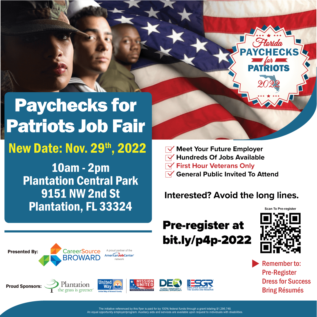 CareerSource Broward and the Broward Workforce Development Board, Inc. will host the rescheduled 10th annual Paychecks for Patriots Job Fair on Tuesday, November 29, from 10 a.m. 2 p.m., at Plantation Central Park Community Center (9151 NW 2nd St. in Plantation). This FREE hiring event, hosted in partnership with the City of Plantation, United Way of Broward County’s MISSION UNITED, the Florida Department of Economic Opportunity (DEO), and Employer Support of The Guard and Reserve, will connect veterans, military families and job seekers with over 75 prominent local employers recruiting for job opportunities in South Florida.