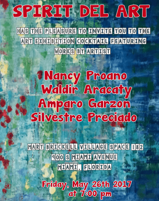 We invite you to the art exhibition/ cocktail party featuring works by latin american artists such as: Amparo Garzon, Nancy Proano, Waldir Aracaty and Silvestre Preciado Friday, May 26th 2017 at Spirit del Art Gallery (space 182) at Mary Brickell Village. Come join us for a good time, complimentary drinks, small bites and music!! For more information you can call us 347-938-0479 or follow us on instagram @spiritdelart.