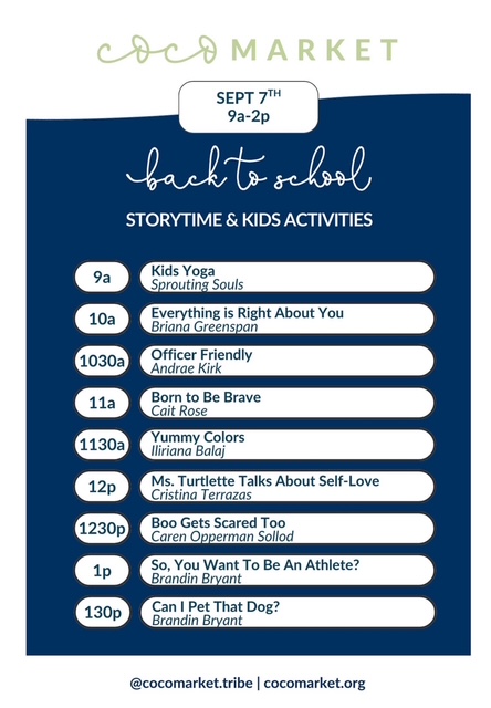 Join Coco Market for a free, family-friendly community wellness festival with yoga, sound healing, live music, local vendors, kids’ activities, a book swap, and storytime with local authors. This month features a Teacher & School Staff Giveaway with 40 educators winning wellness prizes. Free admission + free parking in the garage.