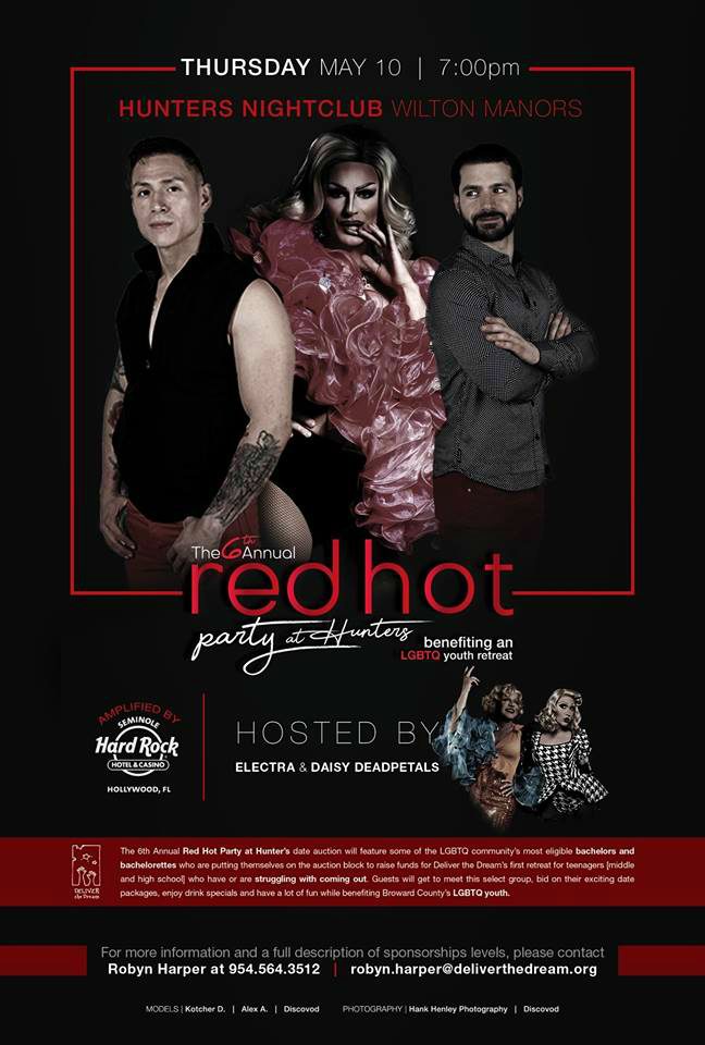 Deliver the Dream, a South Florida-based nonprofit organization that organizes retreats for families experiencing a serious illness or crisis, presents its 6th Annual Red Hot Party at Hunters. Generously amplified by Seminole Hard Rock Hotel & Casino and hosted by Daisy Dead Petals & Electra, this year’s free anticipated event begins at 7 p.m. with a scorching charity date auction showcasing some of South Florida’s most eligible LGBTQ bachelors and bachelorettes of all ages.