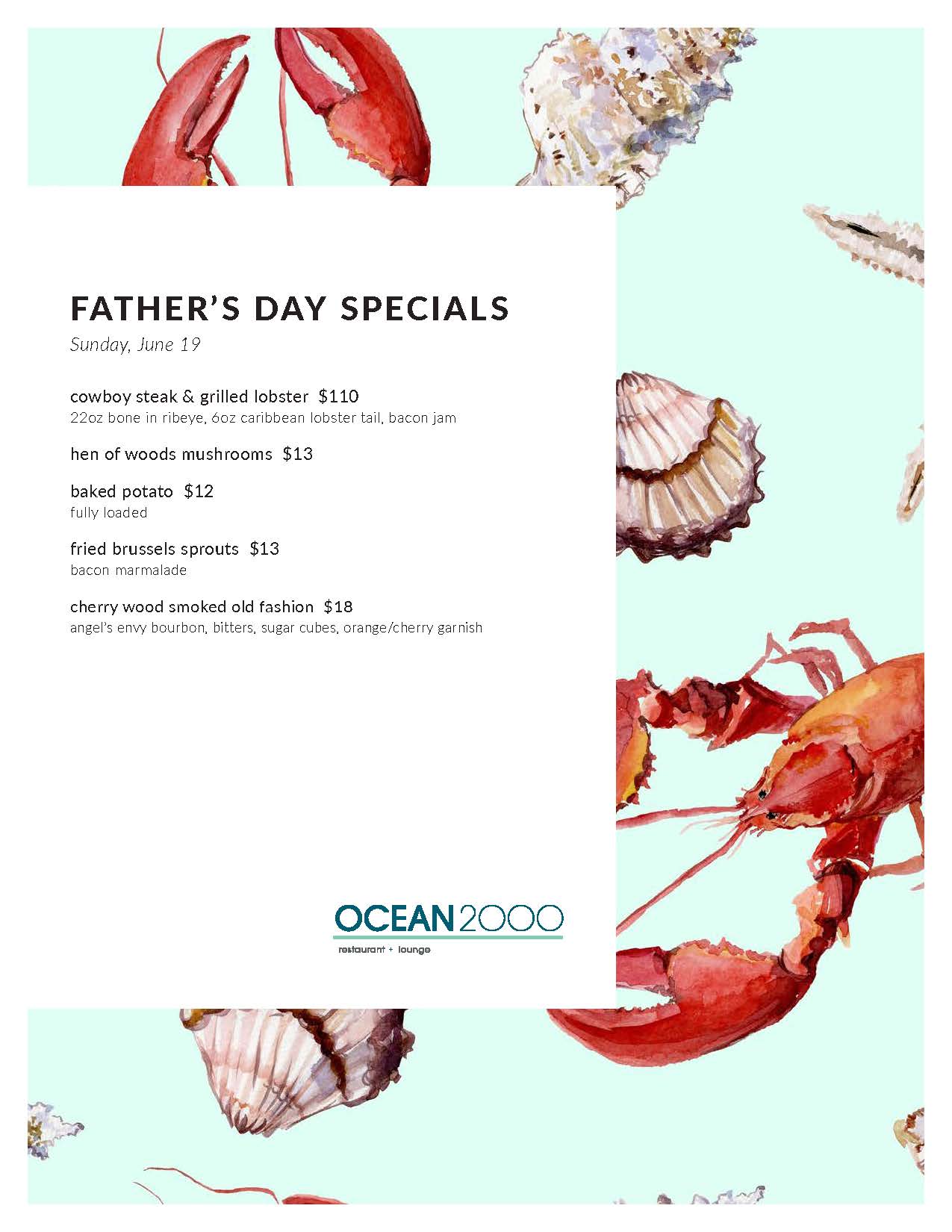 Celebrate Fathers Day at the beach! Take dad out to a fabulous brunch or dinner at OCEAN2000 located at the stunning Pelican Grand Beach Resort overlooking the sparkling Atlantic Ocean. The one-of-a-kind brunch buffet and dinner service will feature Fathers Day Specials such as cowboy steak & grilled lobster, hen of woods mushrooms, baked potato, fried brussels sprouts and a cherry wood smoked old fashion.