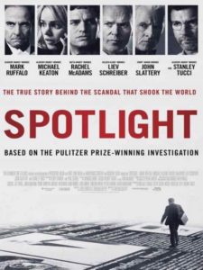 Revealing a string of cover- ups stretching back decades, a team of Boston Globe reporters exposes the Catholic Archdiocese’s history of keeping reports about child molestation and other priest-initiated abuse under wraps. Winner of the Academy Award for best picture and best screenplay.
