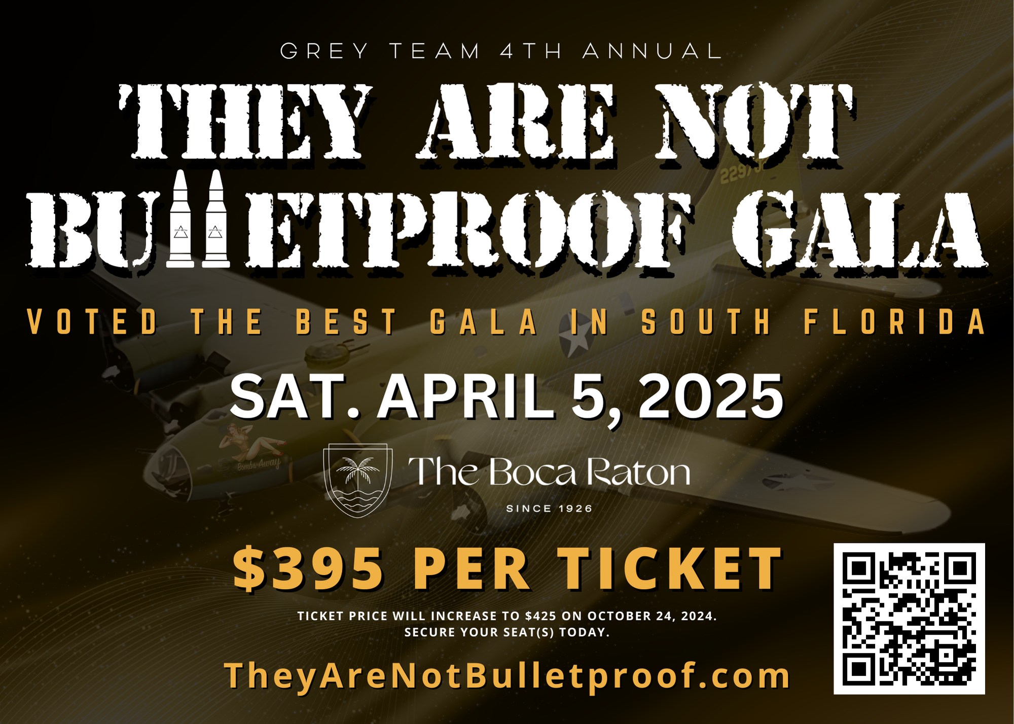 By attending the “They Are Not Bulletproof” Gala, you are making a tangible difference in the lives of our brave service members. Your generosity helps Grey Team provide essential mental health support, prevent military suicides, and expand our services to reach more heroes in need.