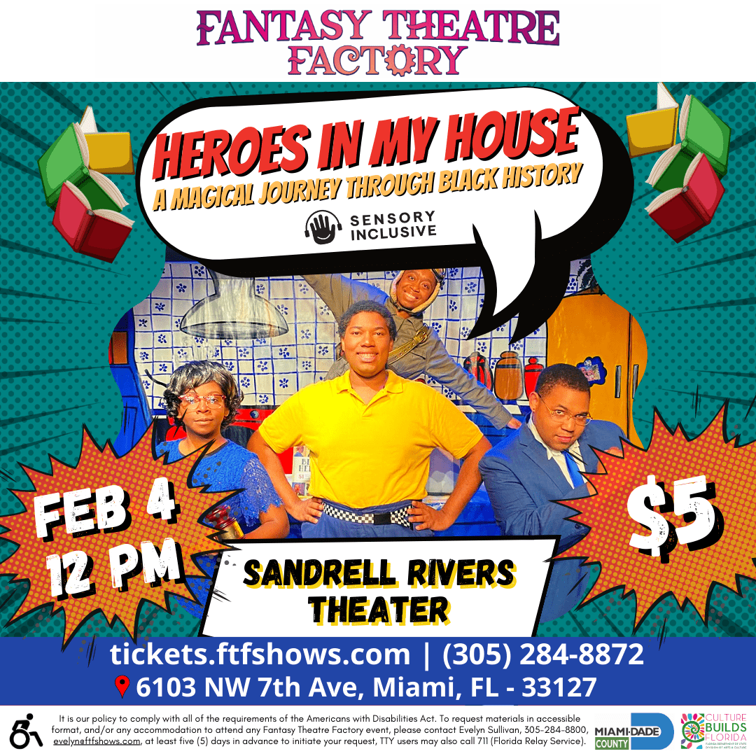 Heroes in My House: A Magical Journey Through Black History follows a young Black student who’s just been assigned to make a presentation about an important figure from Black History. The only problem? The history book has way too many choices! He makes his way to Grandma’s kitchen for her words of wisdom. That’s where things go a little unexpected. Turns out Grandma’s kitchen is MAGICAL and before he knows it, the titans of Black History have sprung from the pages of his book and are there with him … in the house!This is a Live, Sensory Friendly Inclusive at the Sandrell Rivers Theater! Sensory inclusive performances are designed to create a performing arts experience that is welcoming to all families with children with autism or with other disabilities that create sensory sensitivities.This is a Live Sensory Friendly Performance at the Sandrell Rivers Theater. Sensory-friendly performances are designed to create a performing arts experience that is welcoming to all families with children with autism or with other disabilities that create sensory sensitivities.