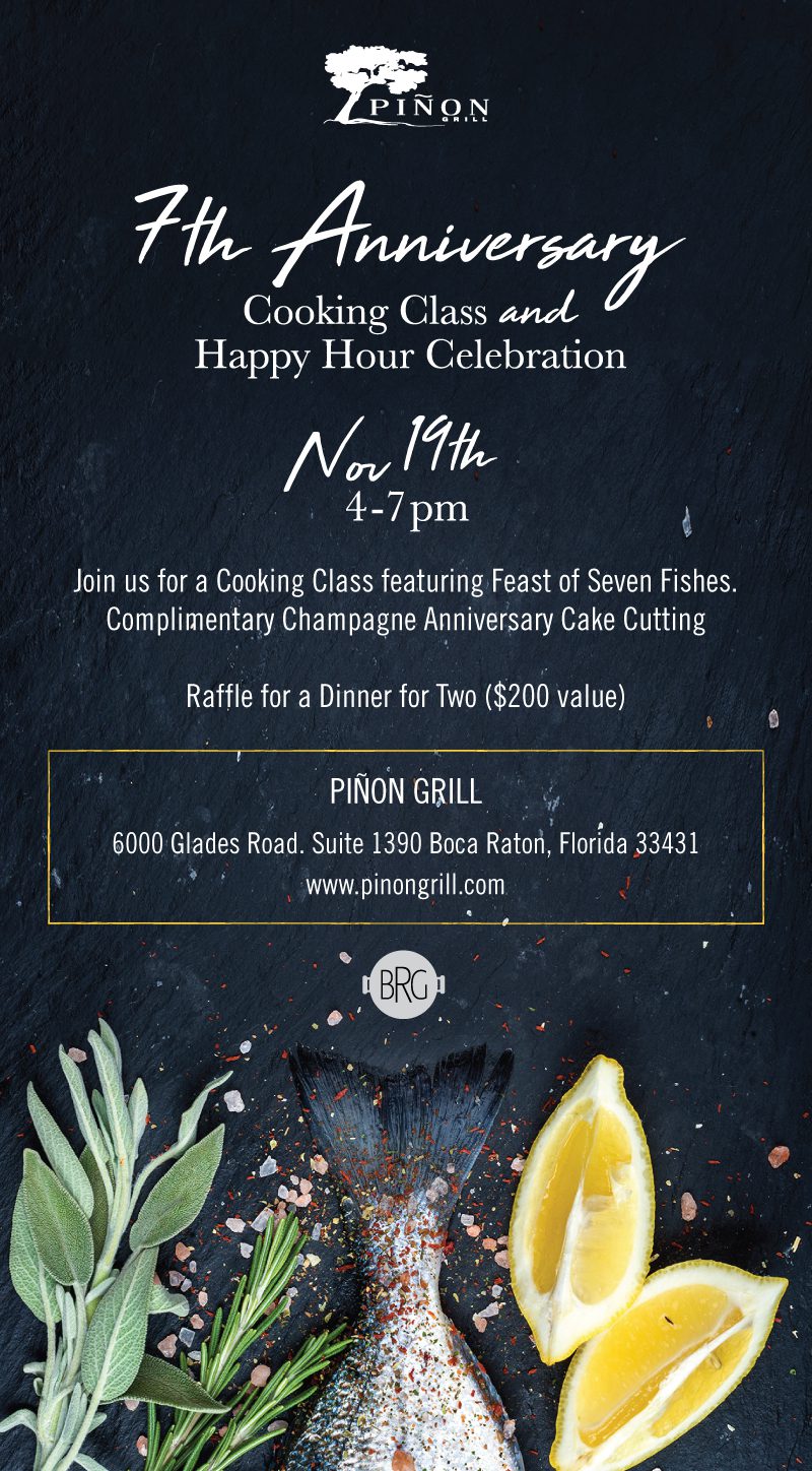 Come celebrate Pinon Grill’s 7th anniversary with us where we will feature a cooking class and happy hour celebration. The complimentary cooking class will showcase the preparation of the Feast of Seven Fishes and guests will be invited to enjoy a glass of champagne toasting to our seven years. The event will conclude with an anniversary cake cutting and a raffle for dinner for two to Pinon Grille ($200 value).