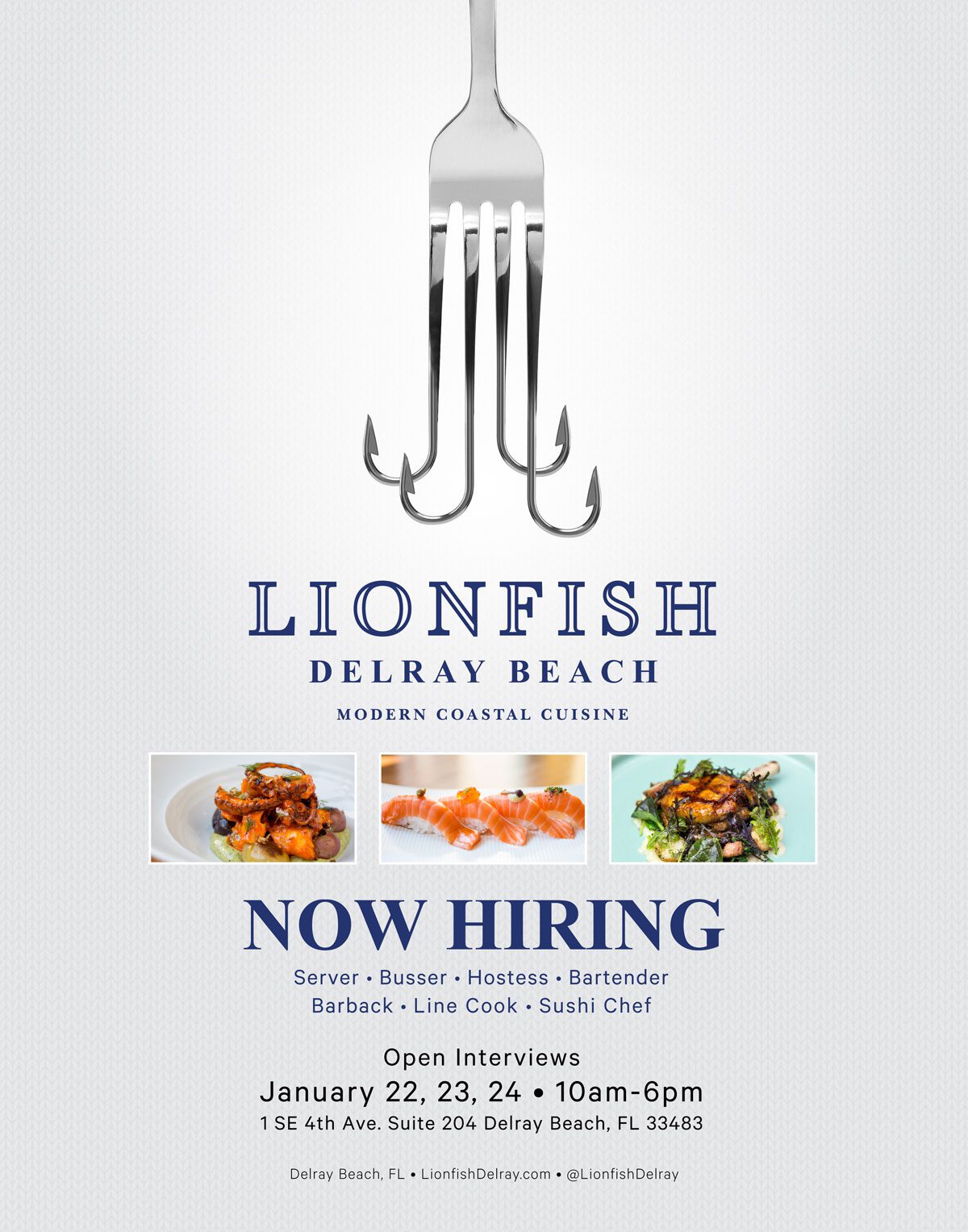 Interested applicants should bring a resume and apply at the in-person hiring fair to be held on Wednesday, January 22nd, Thursday, January 23rd, and Friday, January 24th between 10am to 6pm at the Lionfish Corporate Hiring Office located at 1 SE 4th Avenue Suite 204, Delray Beach, FL 33483.