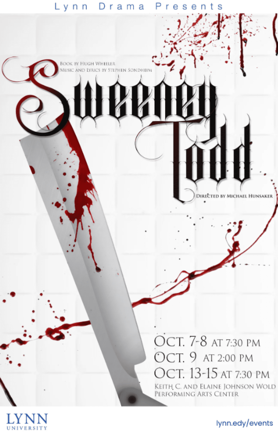 Awarded eight Tonys, including “Best Musical”for its Broadway debut,“Sweeney Todd”is a ‘bloody’ success. Directed by Lynn University Assistant Professor of Drama and Head of Musical Theatre, Michael Hunsaker with music and lyrics by celebrated Broadway composer Stephen Sondheim and book by Hugh Wheeler, Sweeney Todd shares the story of an unjustly exiled barber seeking vengeance against the lecherous judge who framed him and ravaged his young wife in 19th century London. The road to revenge leads Todd to Mrs. Lovett, a resourceful proprietress of a failing pie shop, above which, he opens a new barber practice. Todd’s thirst for blood inspires the integration of an ingredient into Mrs. Lovett’s meat pies … and the carnage has only just begun!