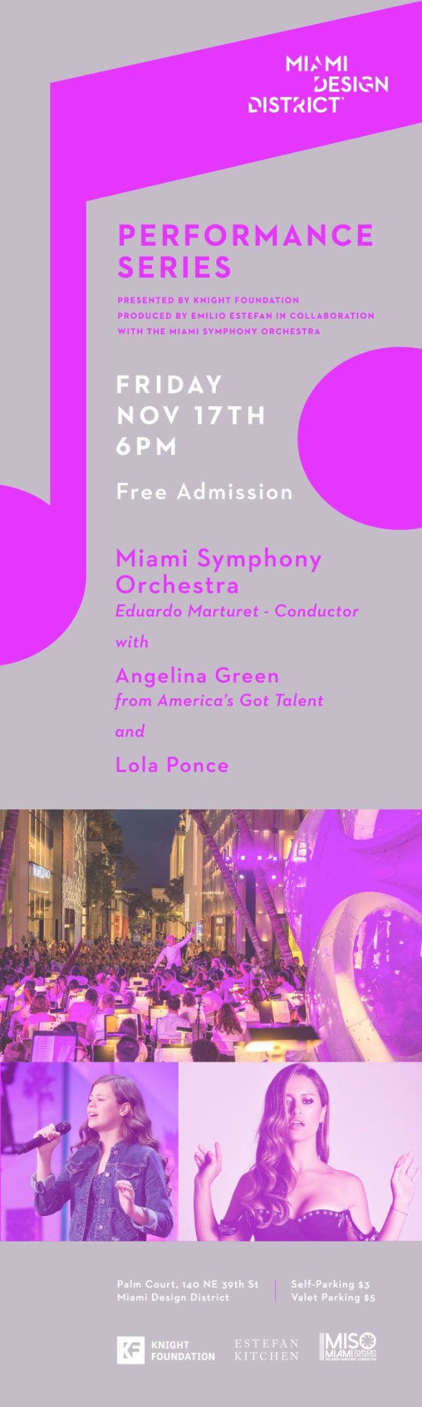 Miami Design District Performance Series Presented by Knight Foundation heads to Palm Court in the Miami Design District for its weekly Friday night ensemble of live musical performances. Produced by 19-time Grammy© Award winning producer Emilio Estefan in collaboration with Maestro Eduardo Marturet (Miami Symphony Orchestra), the music series is offered FREE and open to the public.