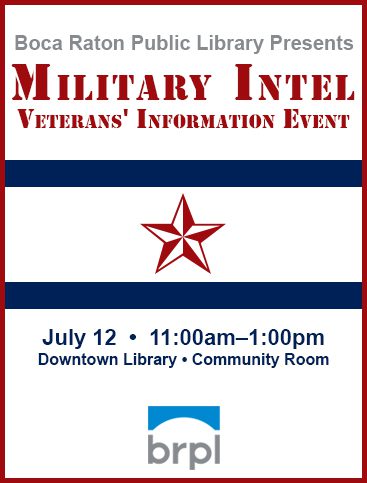The Boca Raton Public Library will host an information event for veterans of all ages at the Downtown Library on July 12 from 11:00am–1:00pm. The BRPL’s Military Intel programs provide veterans and their families with information about benefits, counseling, jobs and more. Presenters include: Pompano Beach Vet Center: Claire Eberhart, Veterans Outreach Specialist; PBC Division of Human & Veteran Services: Andrew Reese, Veteran Service Officer, Army (Ret); CareerSource of Palm Beach County; and, Connected Warriors, Inc. Each organization will present for 20 minutes followed by Q&A. Enroll in this free program through the calendar at bocalibrary.org.