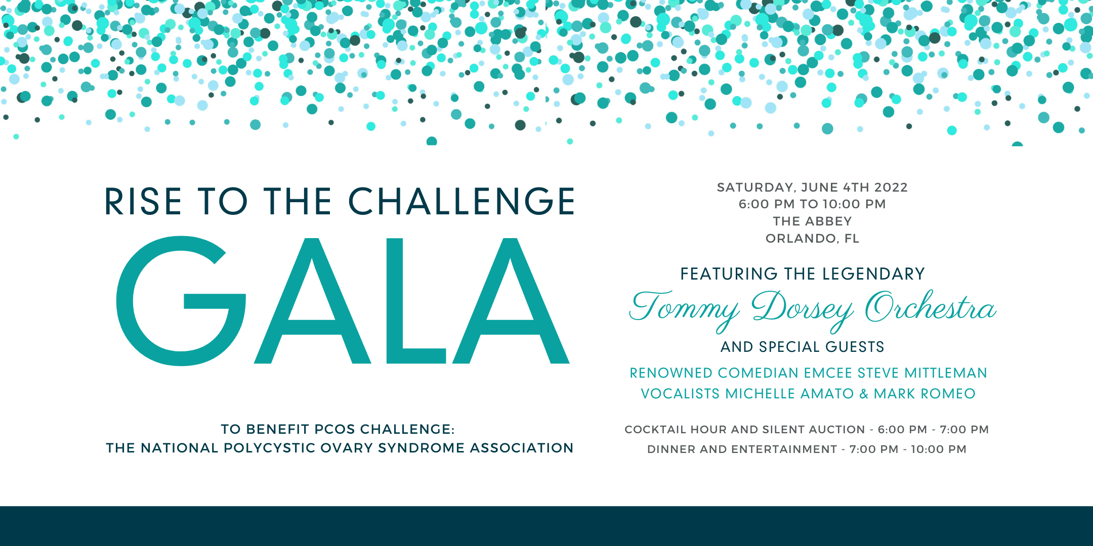Official Rise to the Challenge Gala Orlando Website – https://pcos.ch/gala-orlAttend one of the biggest nights of the year for the PCOS community! The Rise to the Challenge Gala is an incredible night of fun and entertainment. The evening features live music from the Tommy Dorsey Orchestra and special guests, dinner and a silent auction. Funds from the event benefit PCOS Challenge: The National Polycystic Ovary Syndrome Association and help fund critical PCOS research, education, grant, and patient support programs.