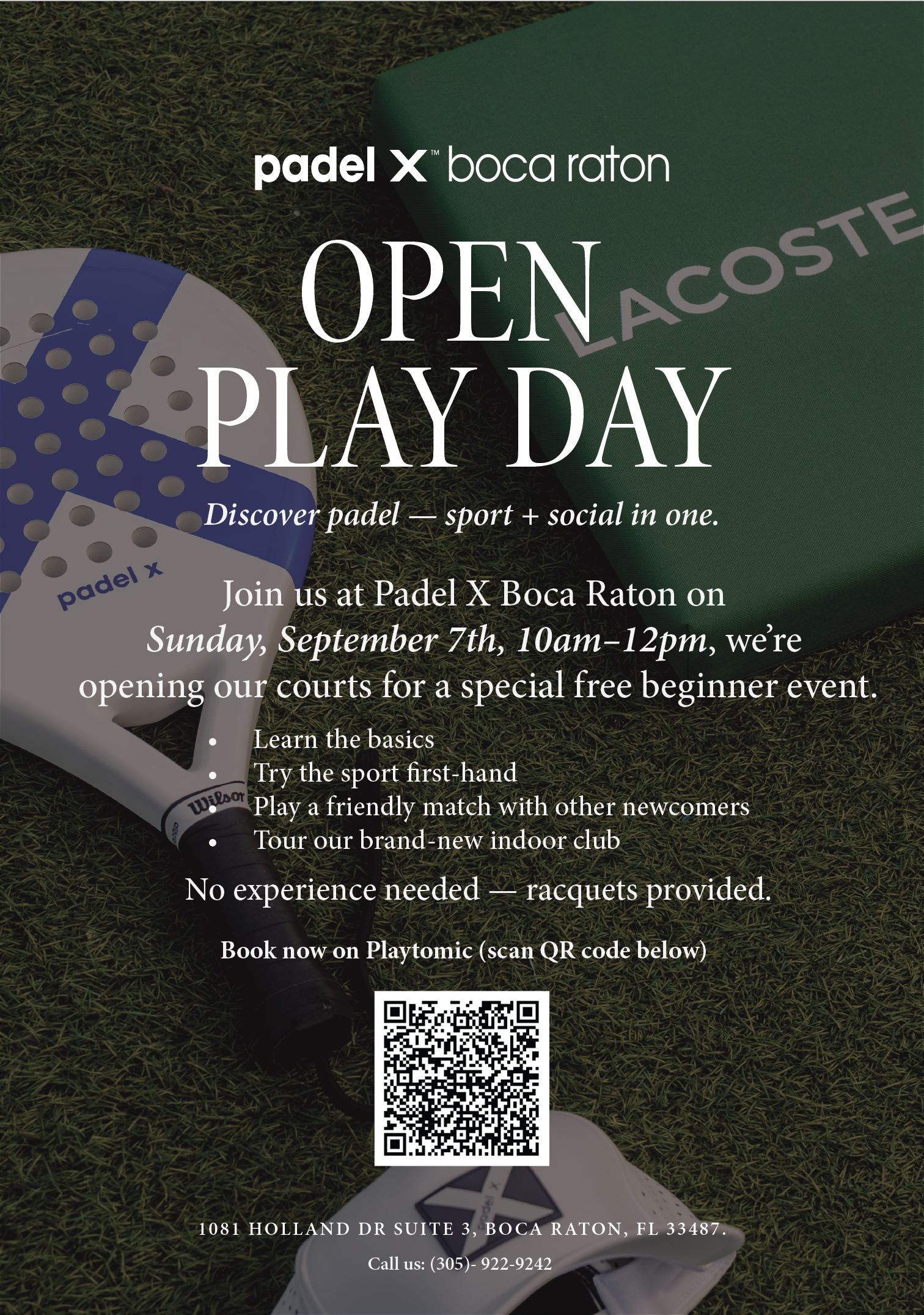 Padel X is South Florida’s premier indoor padel club, dedicated to growing the sport and building community. To celebrate the opening of our newest location in Boca Raton, we’re inviting the public to a special Open Play Day.