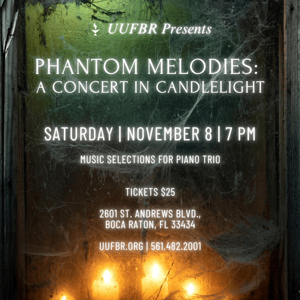 Step into an enchanting evening where hauntingly beautiful music comes alive by candlelight at the Unitarian Universalist Fellowship of Boca Raton. Phantom Melodies: A Concert in Candlelight features a spellbinding program of classical, cinematic, and mysterious works performed live on piano trio. Surrounded by the warm glow of candlelight, the sanctuary becomes an enchanting setting where shadows and sound intertwine, creating an unforgettable night of artistry and atmosphere.