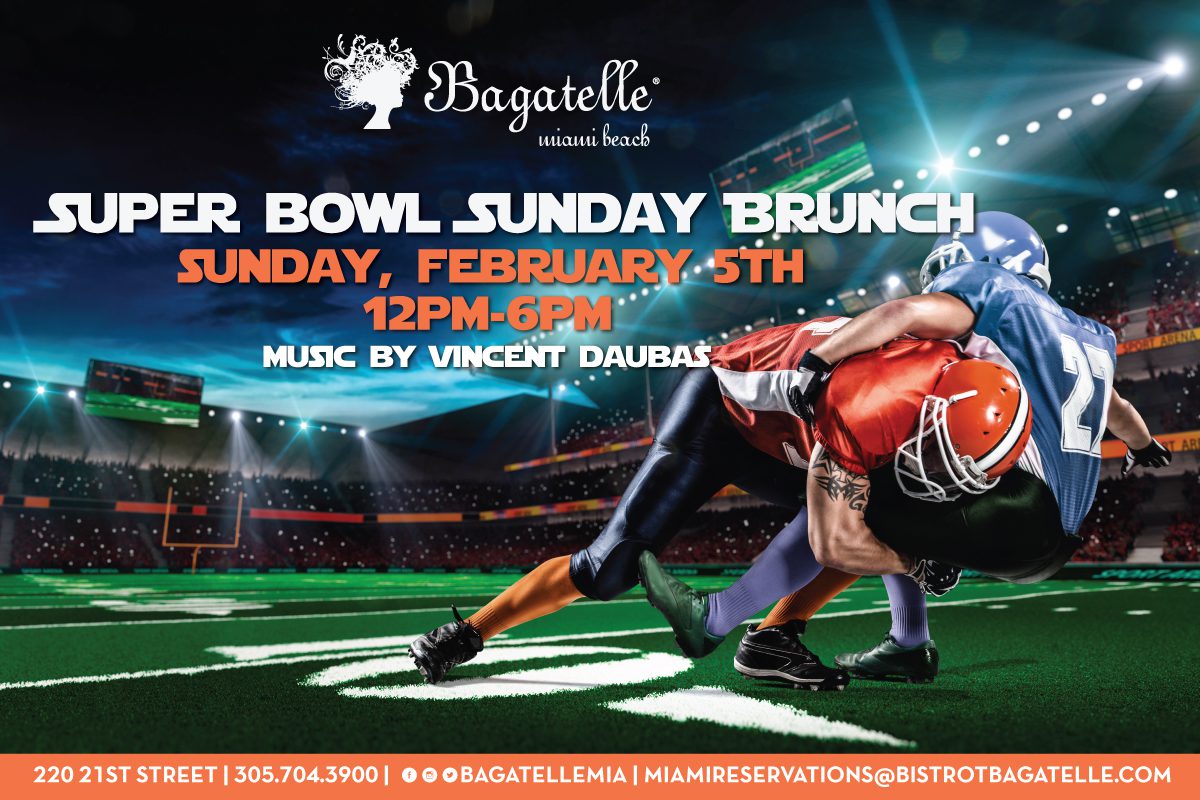 Come cheer on your favorite football team at the Super Bowl Sunday Brunch at Bagatelle Miami Beach Sunday, February 5th from 12pm to 6pm. Enjoy music by Vincent Daubas while watching the game.