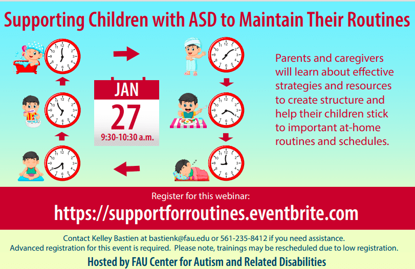 Do you want to know how to support children with ASD to maintain their routines? If you’re a parent, then join us on Jan. 27th from 9:30-10:30am to learn about effective strategies & resources to create structure. Register https://supportforroutines.eventbrite.com