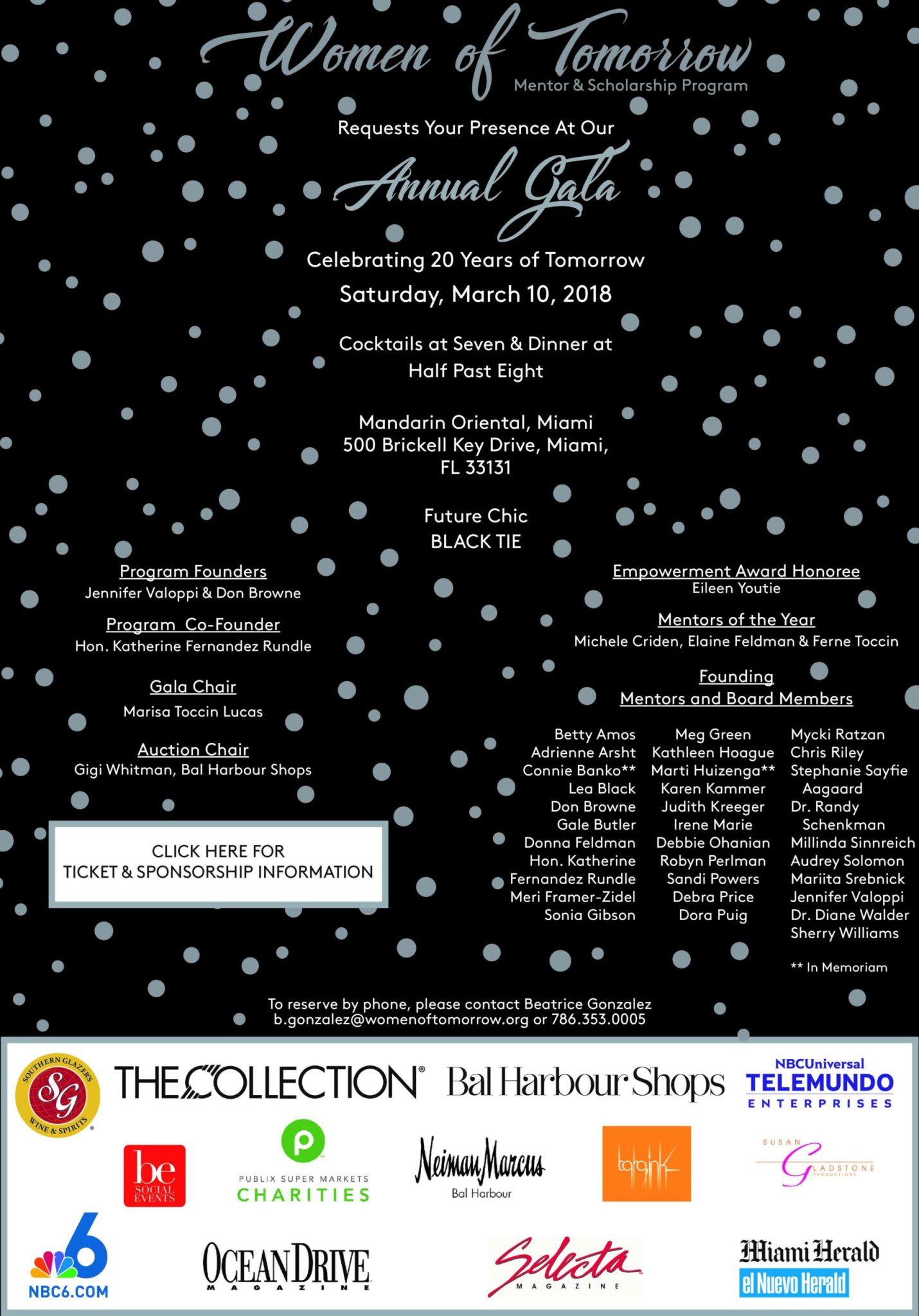 Women of Tomorrow Mentor & Scholarship Program requests your presence at our Annual Gala celebrating 20 years of tomorrow on Saturday March 10th at the serene Mandarin Oriental, Miami.