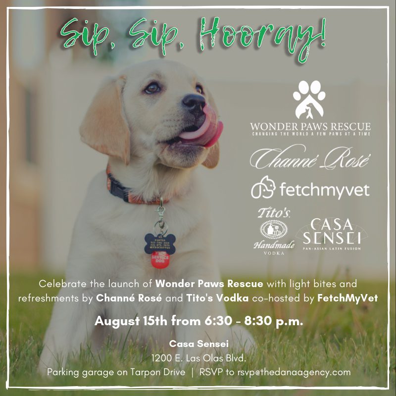 Sip, Sip, Hooray! On Thursday, August 15th from 6:30 p.m. to 8:30 p.m. head to Casa Sensei, a pan-Asian and Latin fusion restaurant in Las Olas, to celebrate the launch of Wonder Paws Rescue, a pet rescue with the goal of finding animals their forever homes, co-hosted by FetchMyVet with light bites by Casa Sensei and refreshments by Channé Rosé and Tito’s Vodka. Bring your pup to the party too! Casa Sensei offers an dog menu as well and includes exclusive ‘dog sushi’ for your furry friends to snack on while you enjoy the festivities.