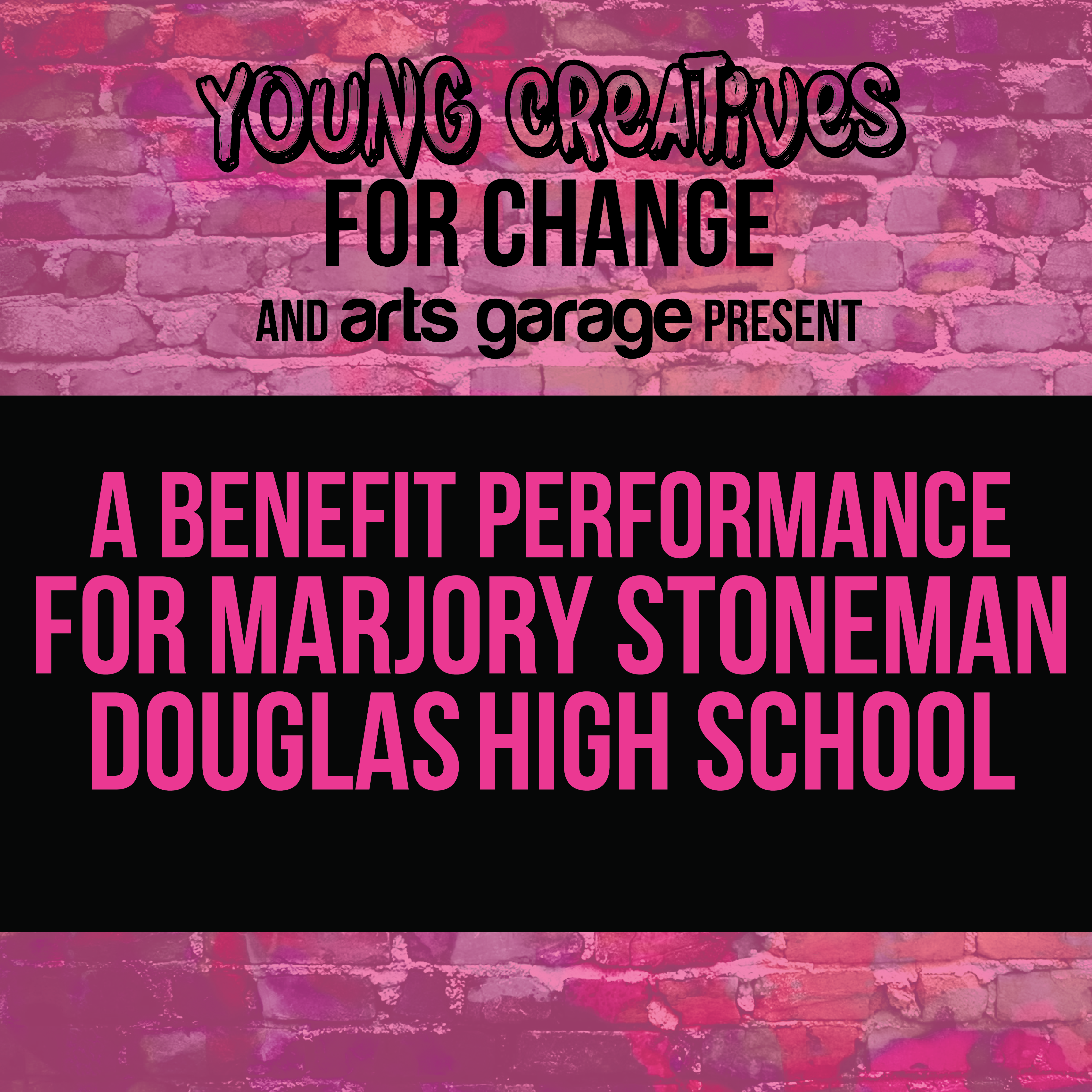 Join us for a benefit performance for Marjory Stoneman Douglas High School. This show was created and produced by Arts Garage’s Young Creatives for Change. The student performances include spoken word artists, vocalists, jazz quintet, a chorus performance and live visual artists. All proceeds benefit MSD. No seating or tables. Standing room only.
