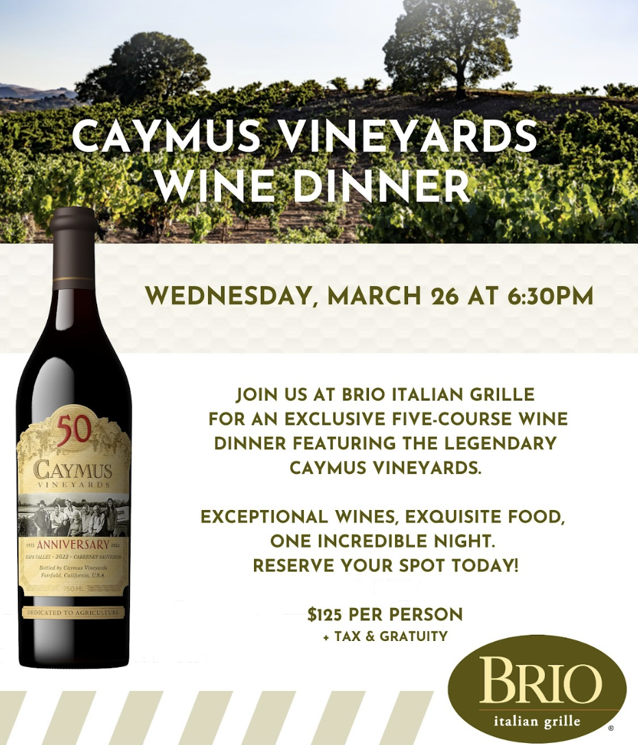 Join Brio Italian Grille on March 26, 2025, for an exclusive Caymus Vineyards Wine Dinner....