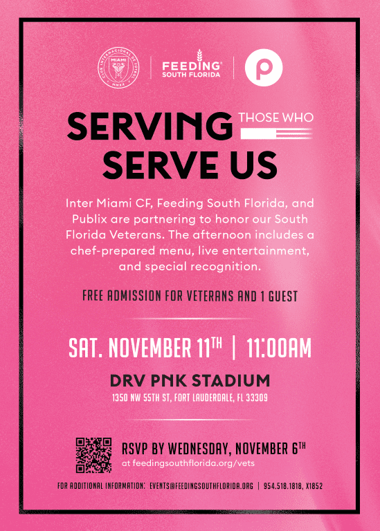 This Veterans Day, Feeding South Florida is teaming up with InterMiami CF and Publix to host a debut appreciation celebration. The inaugural Veterans Appreciation luncheon will be hosted by DRV PNK Stadium on Saturday, Nov. 11, starting at 11 a.m. Veterans and one guest are invited to come to enjoy an afternoon of delicious food and live entertainment. RSVP here.