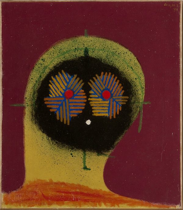 The most impressive works are the ones that most directly offered, as one of the exhibit’s taglines suggests, “radical art as resistance.” Henry Heerup’s “War and Peace” is an epic canvas containing both of these opposites: a scene of pastoral family life interrupted by a giant pitchfork (like Heerup’s best work, it flaunts realist perspective), parachuters and warplanes. In Heerup’s “The Bombers,” planes descend kamikaze-style toward a two-headed figure, one head already slain, the other soon to join it. And it’s hard not to read Nazi symbolism into Pedersen’s “The Big One Eats the Little One,” an oil-crayon painting in which a colossal bird prepares to feast on a tiny one.