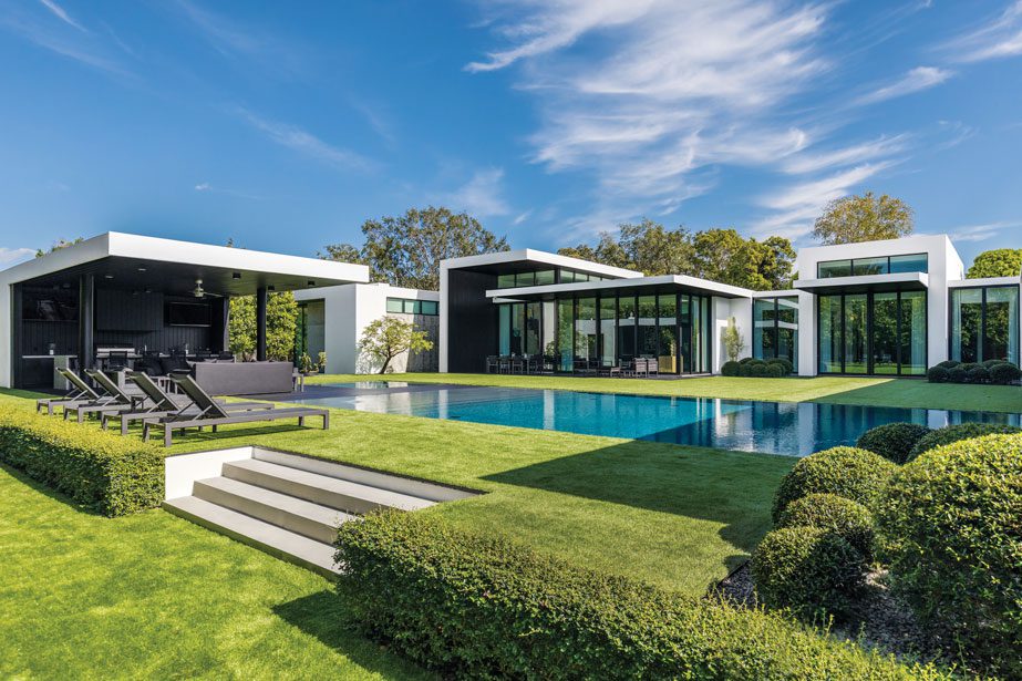 The architects enlisted an innovative, compartmentalized concept in which each space is comprised within its own “pod.” The pods are ingeniously interconnected by a series of pathways and courtyards to promote a sense of unity, so the home’s inhabitants can move about freely without ever having to combat the elements of pouring rain or harsh sun. To further the desirable indoor/outdoor feel, each of the main areas is oriented to open out onto the rear entertainment area, complete with a glasslike swimming pool, swanky lanai and open-air game room.