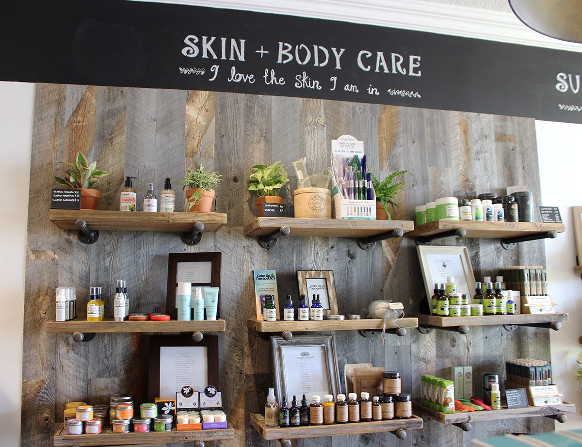 Displayed atop reclaimed wood and pallets, products include laundry detergent and dishwasher soap sold in bulk to cut down on plastic containers. In the beauty section, natural shampoos, soaps, moisturizers, sunblock, shaving cream, lip care and oils are flanked by fresh flowers. On the walls are homewares such as reusable travel utensils, bamboo toothbrushes and natural toothpastes, soy and beeswax candles, and glass reusable straws. Plus, organic snacks, protein powders, supplements, and essential oils.