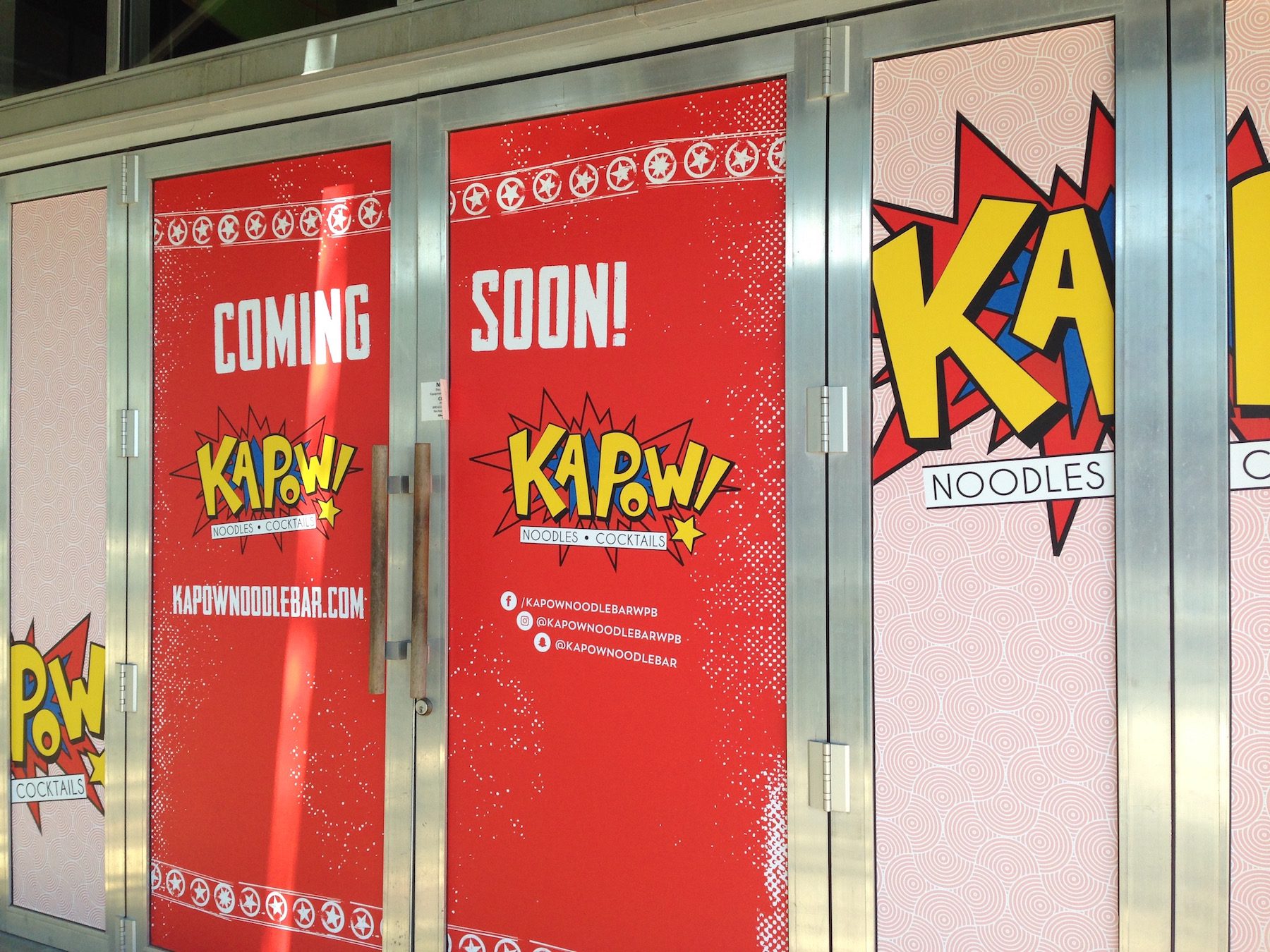 Longboards is gone, a Rodney Mayo restaurant that was next-door sister to Hullabaloo. Hullabaloo is still there, and still has fab pizzas, among other things. The windows are telling us Kapow Noodle Bar, Mayo’s Boca Raton Mizner Park restaurant, is opening a second location there soon.