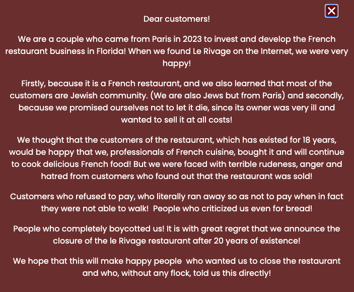 After taking over Le Rivage in 2023, the new owners have announced that they are closing the doors to the French restaurant.