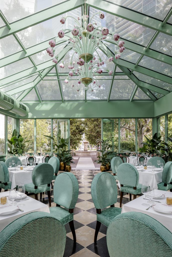 Today, its grounds are verdant once again. In collaboration with legendary designer Ken Fulk, the team created a first-floor bar, dining room, and glass-enclosed greenhouse dining room with a sun-filled wrought-iron staircase and sparkling chandelier leading up to the second-floor members-only lounge, terrace and private bar.