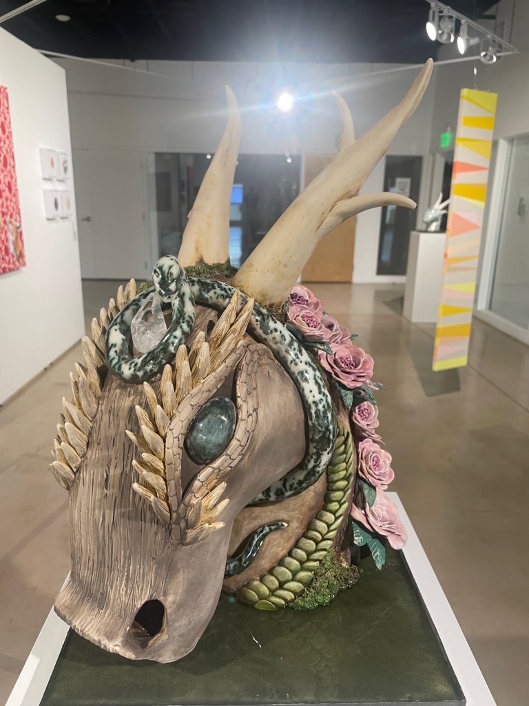 Transitioning into the fantasy realm, selections of kiln-fired, individualistic dragon busts from Jess Burbridge’s “Elemental Guardians” series of ceramics dot the gallery, watching over the space—often with eyes of reflective labradorite—like protectors. On the surface of “Eden,” a serpent surrounds a quartz crystal at the mythical beast’s third eye, while flowers and mushrooms bloom around it; the sculpture truly evokes its Biblical name. In “Naidara,” an homage to the naiad, barnacles and other marine dwellers cling to the dragon’s scaly surface, its colors a coastal palette of oceanic blues and whites.