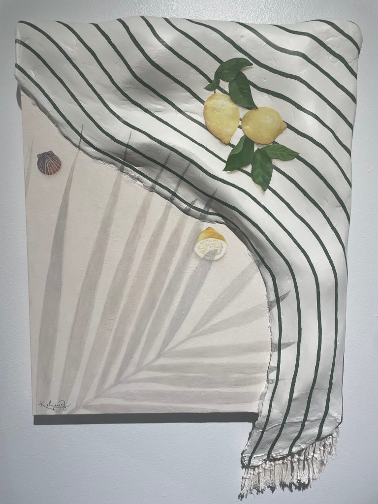 I’ll close this review with a big smile, which is what the 3D mixed media works of Kelsey Paz Snyder conjure. In “Fresh Squeezed,” a plaster-of-Paris sculpture of a Turkish towel adds weight and depth atop a painting of a beach picnic, in which a cut lemon fell from its surface onto the sand. The reflection of a palm tree, cast on both the two- and three-dimensional elements of the canvas, serves as a lovely detail, and adds a sense of place to the scene.