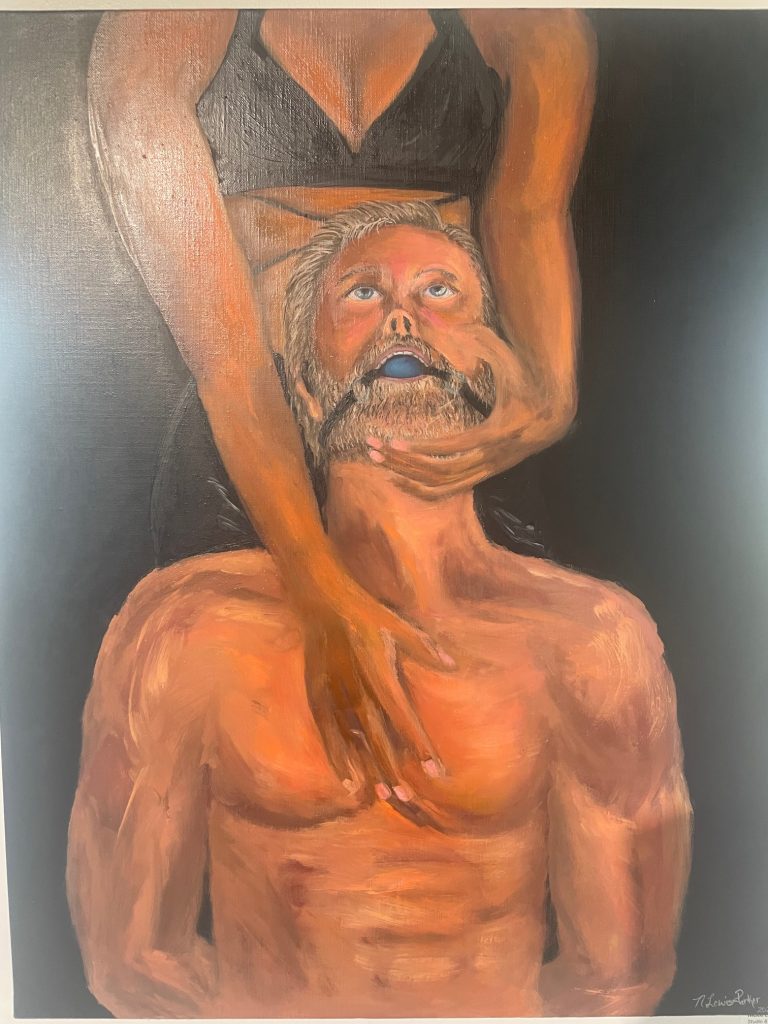 Other highlights include two works by Nickki Lewis-Parker exploring the S&M subculture. In “Adam,” the titular figure is faceless and painted from behind, his sinewy arms and back a subtle dance of shifting colors and shadows. The same color palette informs “Atlas,” in which a ball-gagged man stares up at his dominatrix with puppy-dog eyes, and her arm reaches over his bare chest, each consenting adult engaging in a beautiful ballet of control and tenderness.