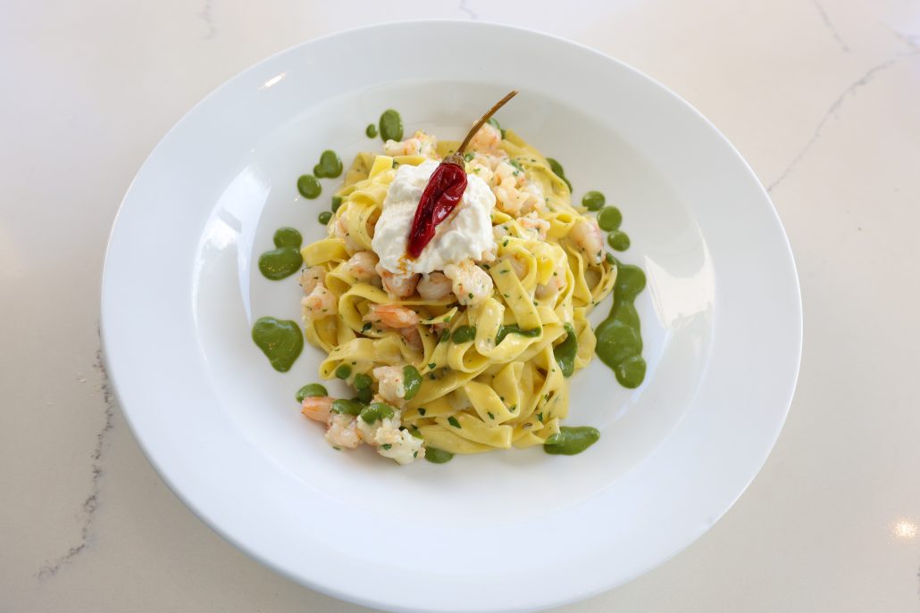 The family’s hospitality deftness and Executive Chef Pierangelo Badioli’s passion for his familial dishes are the driving forces behind Acqua Café’s popularity. The evening I visited, every seat was taken. The crowd was a mix of families, with several generations enjoying a meal together, couples on a date night and friends giggling with cocktails in hand. Its design is more contemporary than its counterparts, with sleek acrylic chairs and a dazzling glass bar bathed in blue light.