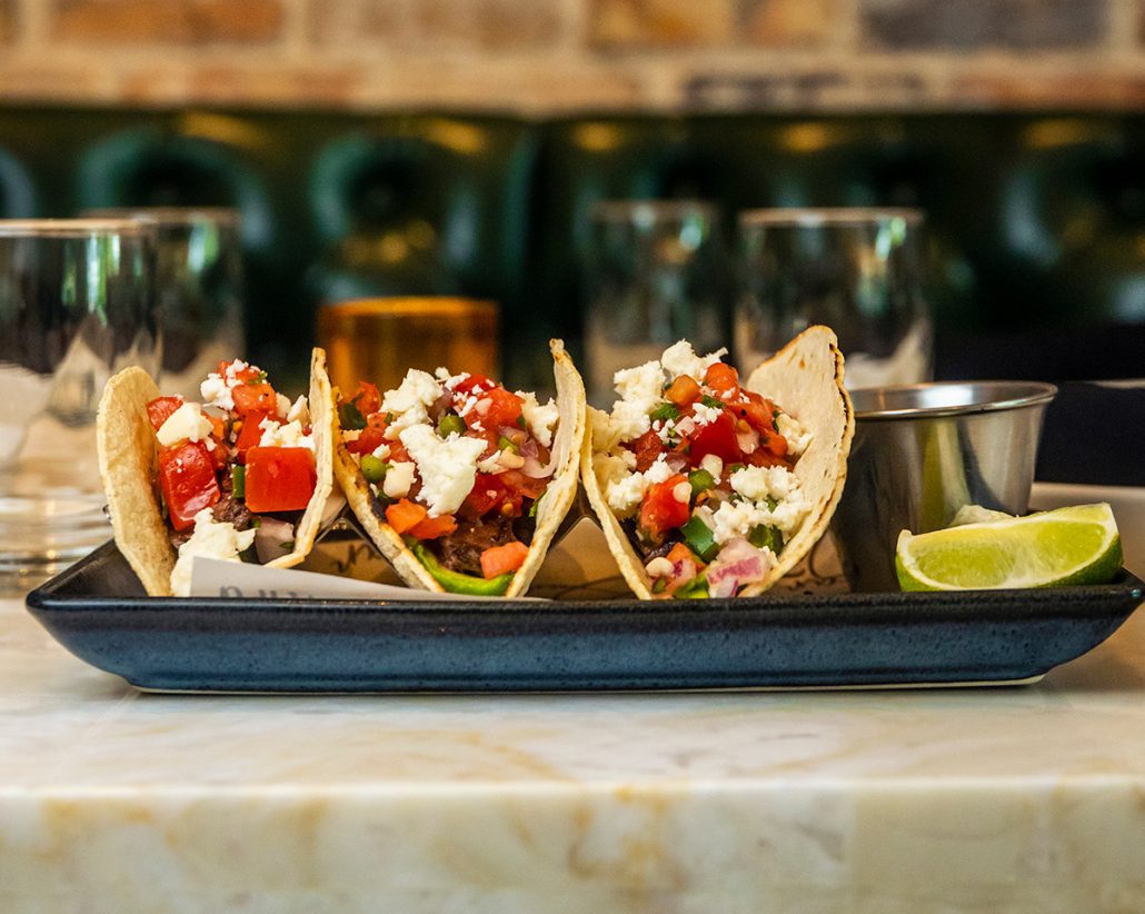 The Honey Buffalo Cauliflower Tacos ($16) and General Tso Fried Chicken ($18) arrived next. The tacos had a balanced sweet and tangy spice to them, and the buttermilk ranch slaw topping wasn’t dripping in mayo, which I appreciated. The chicken, a recommendation from our waitress, was straightforward thin bites of sweet and crunchy. As an overindulgence, we ordered the Old Bay Fries ($11) with our Wagyu Sliders ($28) because the menu’s description of Old Bay seasoning with white American cheese sauce was too intriguing to pass up. However, for the price point I thought the dish would be more like cheesy nachos, when in reality it was a tin of fries with a dipping cheese sauce that, while warm and gooey when it arrived, quickly turned too hard to even dip. The sliders were a highlight, a generous portion that included three juicy patties piled high with blue cheese and a chunky bacon onion jam.