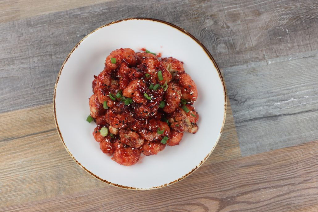 We had to start with a signature crispy rice selection, so we went with the tuna tartare ($16). Perfect for sharing with four pieces per order, the balance of crunchy rice and soft tuna was a wonderful start to our meal. Each piece is topped with tobiko that adds to the crunch, while the minute piece of serrano pepper plays off the truffle honey soy drizzle. We also opted for the spicy skirt steak tacos ($16) and General Tso’s cauliflower ($15). The tacos had a delightful crunch and were well seasoned without being overly heated, but the cauliflower was certainly the table’s favorite, with its sweet and savory flavors.