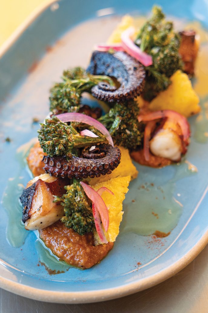 Since the menu constantly changes, I won’t go into much detail about our meal. Still, I will dish about the house-made mozzarella ($21)—warm, gooey and sharing a soft slice of bread slathered in garlicy pesto with the most delicious baby tomatoes I’ve ever savored. The sea bream ceviche ($24) was superb, an edible piece of colorful modern art with pieces of ripe orange, juicy grapefruit and tender avocado balanced with crunchy red onion and cancha corn.