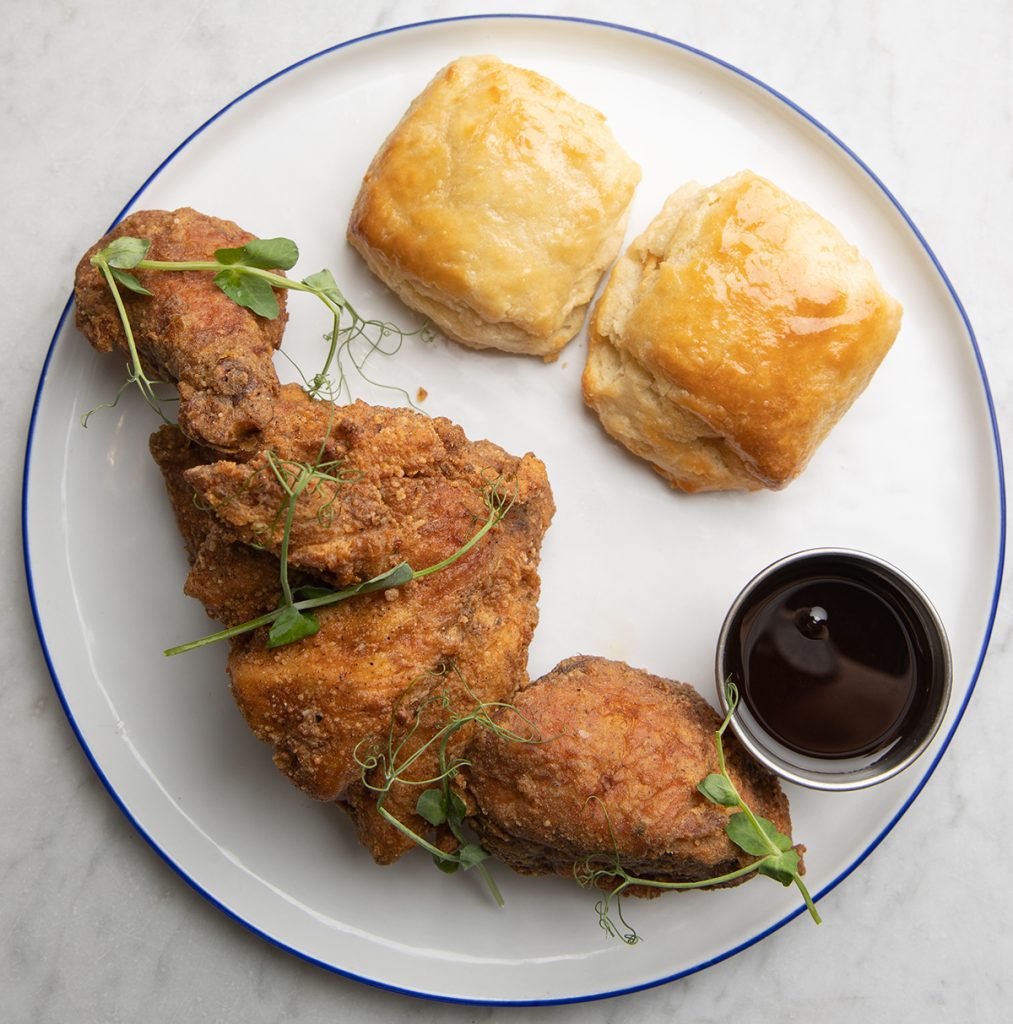 The menu features a variety of New Orleans, southern and French-inspired dishes, such as pimento cheese dip, oysters casino, shrimp po’boy and bouillabaisse. It also offers several well-labeled gluten-free dishes. We opted for a family-style dinner, so we shared the buttermilk biscuits ($11), mac and cheese bites ($14), gumbo ($15), fried chicken ($25), and shrimp and grits ($33).