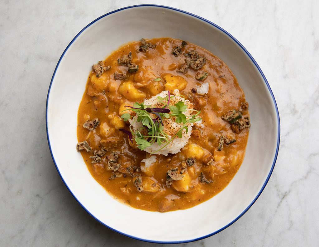 The biscuit wasn’t the fluffy, buttery cloud I’m accustomed to, but its slight staleness disappeared when I dipped it into the thick gumbo topped with white rice. Floating inside the golden roux, bits of chicken, shrimp, andouille sausage and crunchy fried okra clung to it, making the biscuit a perfect vessel. The dish is hearty and makes for an ideal comfort meal for a cool winter day.